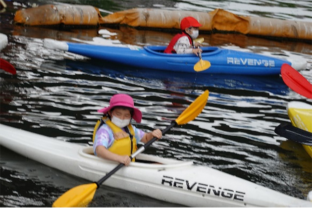 夏には、公園内の川に出られる場所で開催されているカヤック体験にも参加しています。一人ずつカヤックに乗り込みパドルを操り自在に漕いでいます。