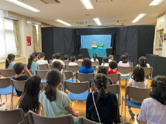 柏尾小学校では、地域のボランティア活動グループ「サークル空」さんが月に1回工作か人形劇をおこなってくれます。 みんな集中して観劇しています。
