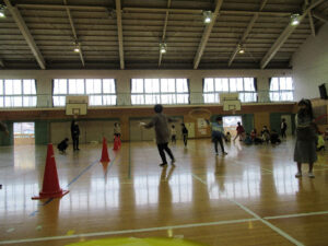 体育館:ドッジボール予選会に向けて1年生も参加しての混合チームで練習中!